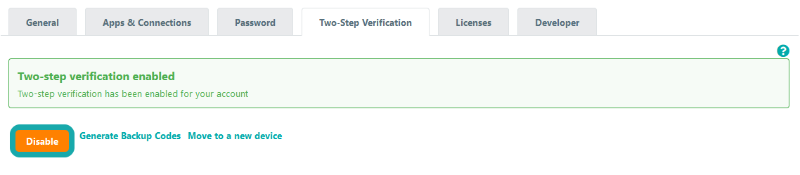 Two-step verification is now enabled. Please make sure to never remove the app from your authenticated device before disabling the two-step verification setting first. We also recommend that you download the back-up two-factor codes, which can each be used once to access the application if you lose your two-factor code generation device. In the event that your account is blocked while two-step verification is enabled, this setting can be disabled by an administrator via the Organization Admin Panel. Cloud users can alternatively contact our Support Desk to disable two-step verification on their account.