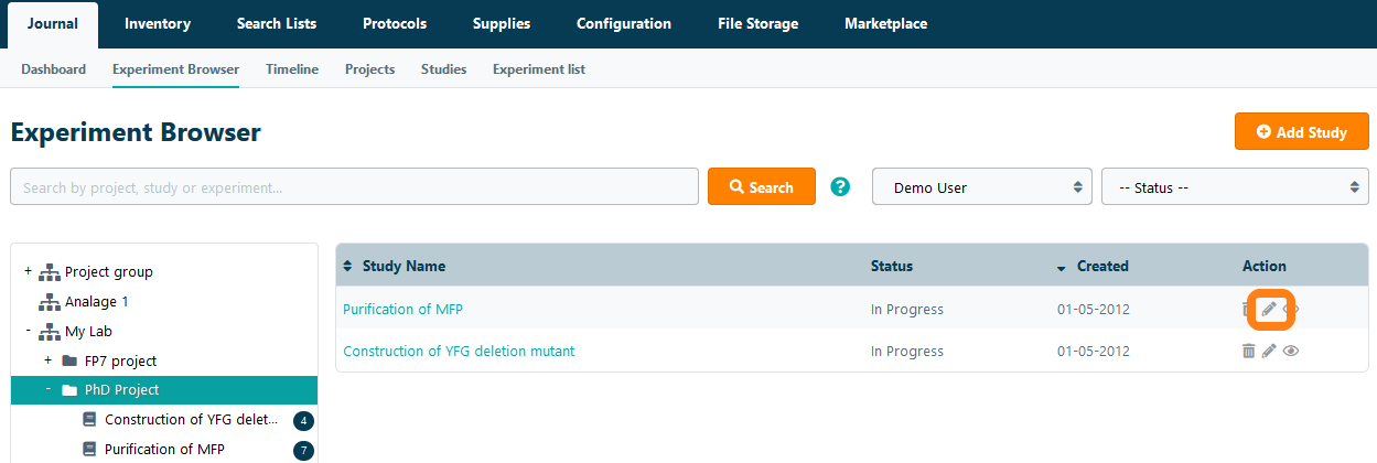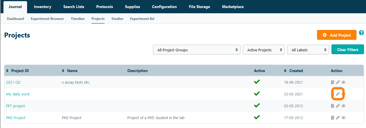 You can edit a project to update its information or collaboration settings. Navigate to the Experiment Browser taband open the Projects page. Click Edit to update the project.