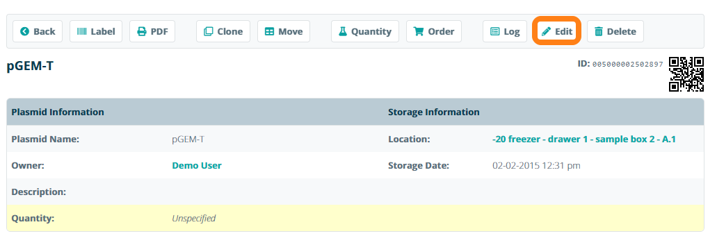 In the sample edit view, you can change the information in all standard fields and the sample specification fields. You can also add a note, move a sample to a different location, or set or change the sample quantity (only available if the Supplies module is active). After changing the relevant sample information, click Save and Close to store the updated sample information. Note that all changes to sample information are logged in the sample log, according to GLP compliance.