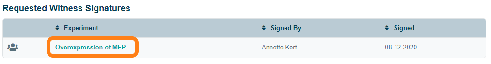 The assigned witness will receive a notification of the signature request. and the experiment will be listed on their Dashboard under the Pending Signature header. If you have installed the eLabJournal Mobile App, you will also receive a notification on your mobile device.