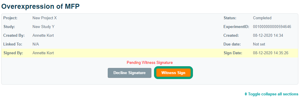 On the signed experiment's page, the witness has the option to approve and witness sign the experiment or to decline and unlock the experiment. In the latter case, the user that created the experiment receives a notification with the witness' note about how to adjust the experiment before resubmitting it for signing.