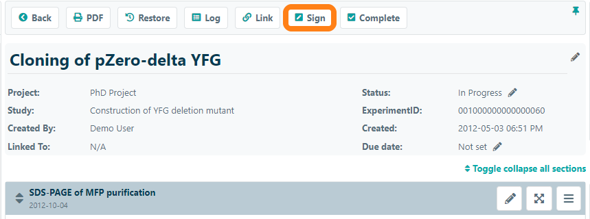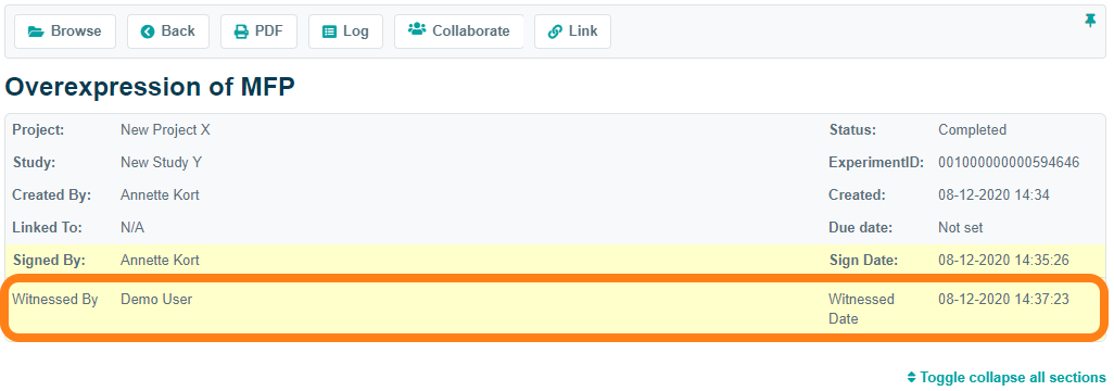 Once the experiment is counter-signed, the witness signature with timestamp is added to the experiment header. If you need to amend the signed experiment with additional information, you can add a comment. If this option is insufficient, you can create a copy of the locked experiment and link both versions so that the copy refers back to the original. This approach ensures that the full audit trail of data including correct timestamps remains intact in accordance with GLP guidelines and CFR 21 part 11 regulations.