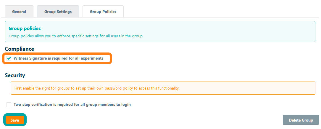 The option to enable counter-signing is a group policy that can be activated by the group's administrator. Navigate to My Groups and click Edit. Open the Group Policy tab to activate the witness-sign option for your lab.