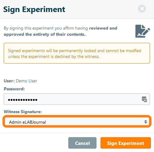 Once the witness signature option is active, experiments will require a second signature before locking. When signing an experiment, you will now have the option to assign a witness to counter-sign the experiment. Select the witness from the list of users in your lab. Note that only users with permission to witness-sign experiments will be listed. Once an experiment is signed, the experiment will be temporarily locked from further modification. Note: the witness' signature is required in order to permanently lock the experiment. If the witness declines the signature request, then the experiment will be unlocked for further editing.