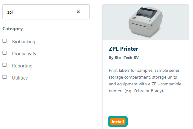 To enable printing of barcode labels with a Zebra© or other ZPL-compatible printer in eLabJournal, confirm that the printer is capable of processing ZPL code (i.e. .zpl label template files) and install the ZPL Printer add-on from the Marketplace.